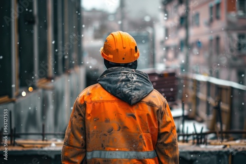 Back view of construction worker at construction site, building in uniform orange uniform