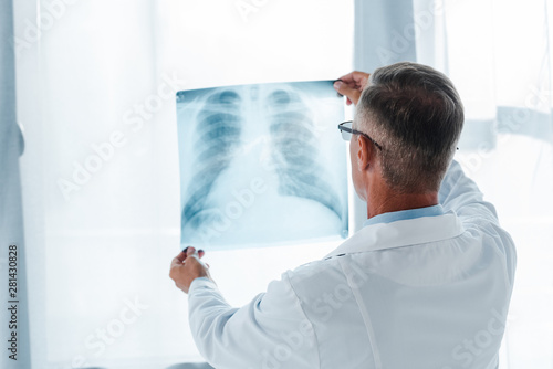equipment, holding, adult, health, medicine, health care, medicals, man, clinical, doctor, hospital, stethoscope, indoor, profession, ray, diagnosis, x-ray, clinic, medicare, radiology, professional occupation, one person, backview, white coat