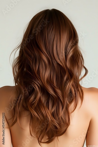 Back view of wavy brown hair with copper highlights showing modern layered cut and natural movement. Professional salon styling demonstrates healthy shine and texture.