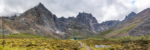 Backcountry camping area of Tombstone Territorial Park off Dempster Highway during summertime on a cloudy morning from the Grizzly Lake hiking trail with hiker in blue jacket.