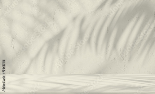 Backdrop light beige podium display for product. Interior room with sunlight and shadows on beige concrete wall surface