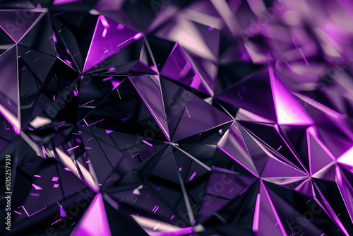 Backdrop with contemporary abstract design featuring layered black and purple triangles and geometric shapes. Modern geometry background. front view. Digital 3D render. wallpaper with texture.