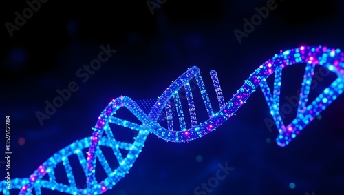 backgroud 3d A vibrant 3D rendering of a DNA double helix, illuminated with glowing blue and purple lights against a dark background