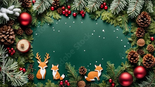 Background for a greeting card on the theme of a winter forest. With a place to copy the text. Snow-covered ground, pine twigs, snowflakes, tiny animal tracks and white berries.