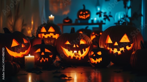 background of a table filled with scary pumpkin carvings, lit by candles, with shadows dancing on the walls