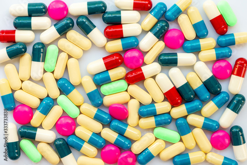 Background of colorful pills, health and medication, coronavirus, covid-19 treatment concept
