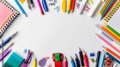 Background of colorful school supplies isolated on white. Back to school concept