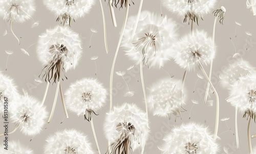 Background of large white fluffy dandelions on a beige-gray background