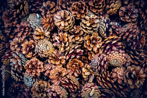 Background of macro closeup of dry brown pinecones pattern showing detail and texture in winter holiday season