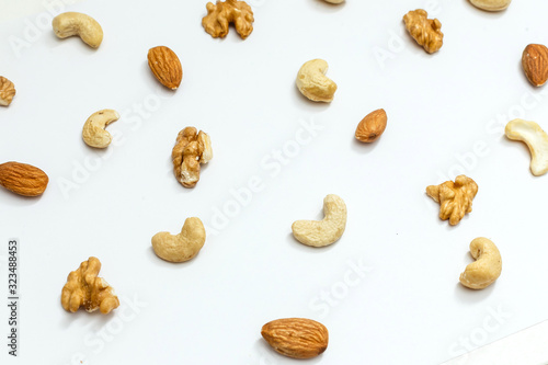 Background of nuts - pecan, macadamia, walnut, almonds, hazelnuts, and other - with copy space. Isolated one edge. Top view or flat lay