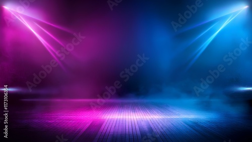 Background smoky texture in blue, purple and pink colors. Dark scene with neon lights and spotlights illuminate empty dark background.