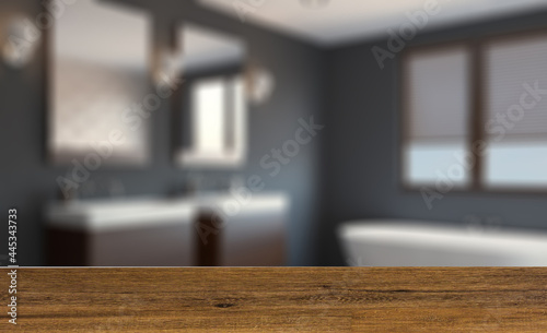 Background with empty table. Flooring. Spacious bathroom in gray tones with heated floors, freestanding