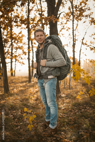 nature, outdoors, autumn, hiking, backpack, man, backpacker, people, forest, smiling, lifestyle, adult, walking, one person, adventure, male, leaf, avocation, happiness, young adult, relaxation, recreational pursuit, cheerful, casual clothes, tree, footpath, enjoyment, activity, yellow, season, healthy lifestyle, timberland, day, vacation, standing, adults only, holiday maker, portrait, one man only, copy space, color image, young men, travel, woman, looking, exploration