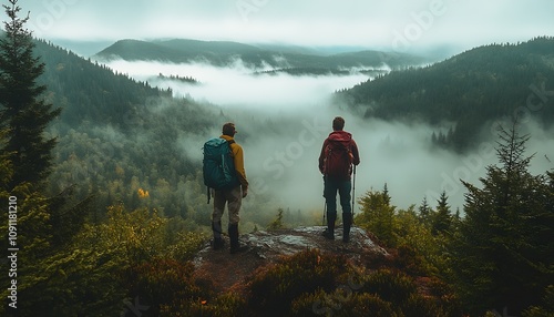 Backpackers Enjoying Scenic Mountain View on Misty Morning Adventure : Generative AI
