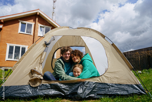 backyard camping. parents and daughter are sitting with a tourist tent in the backyard
