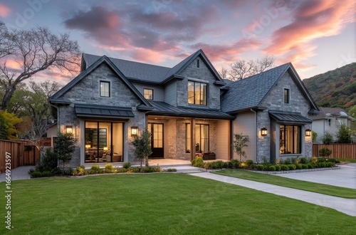 backyard of single story home in south austin, texas at sunset with large backyard and beautiful landscaping