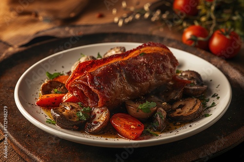 Bacon Wrapped with Mushrooms, Carrots, and Fresh Herbs on a BBQ Grill
