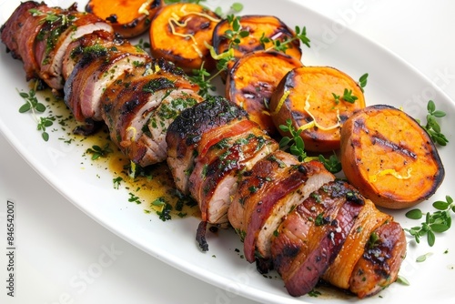 Bacon-Herb Wrapped Pork Tenderloin and Caramelized Lemon Glazed Sweet Potatoes