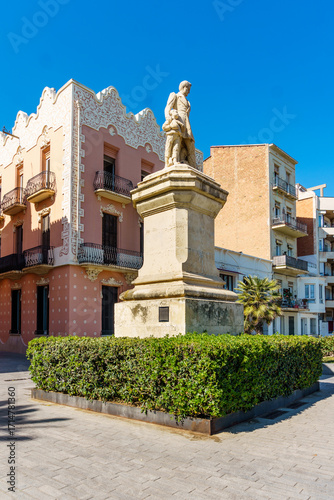 Badalona, Spain-May 2, 2023. Ramblas , Badalona, Spain with modernist buildings and the statue of Roca i Pí. Seafront promenade