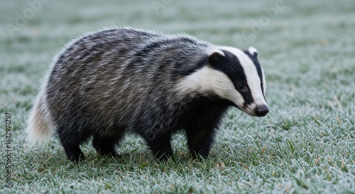 badger, animal, wildlife, frosty, field, grass, fur, black, white, nature, outdoors, winter, cold, mammal, hoofed, predator, prey, furry, nocturnal, mammalian, vertebrate, protected, endangered, solitary, alert, moving, walking, standing, portrait, closeup, detail, sharp, sharpened, landscape, background, green, grey, frosted, frigid, autumn, dawn, dusk, horizontal, image, photograph, wild, european, ground