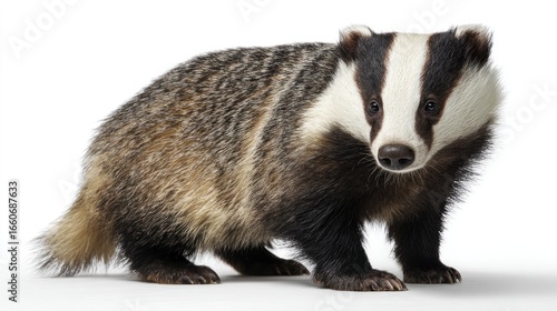 badger, animal, wildlife, portrait, mammal, cute, fur, stripes, black, white, grey, side, profile, studio, isolated, sharpened, detail, nature, closeup, adorable, innocent, wild, vertebrate, small, standing, body, coat, natural, medium, furry, front, rear, sharp, symmetric, elegant, robust, powerful, alert, looking, straight, horizontal, white background, image, photo, animal portrait, mammalia, predator, omnivore