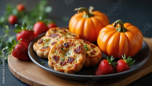 Baked cheese toasts with fresh strawberries and pumpkins.