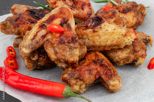 Baked chicken wings with and sweet chili sauce on wooden board over dark background