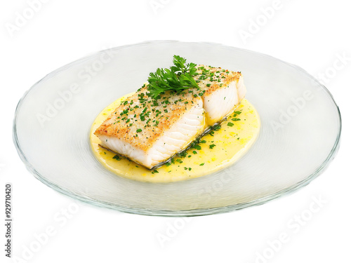 cod, lemon, butter, sauce, parsley, garnish, clear, glasses, light, isolated, transparent, background, meal, food, plate, dinner, cookery, cooked, portion, homemade, fresh, eatery, dish, serving, closeup, slice, baked, epicure, traditional, lunch, nourishment, tasty, nobody, rustic, piece, delicious