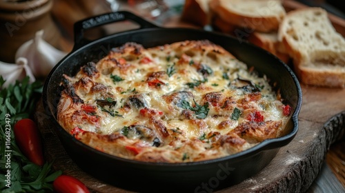 Baked dish in a cast iron pan on a rustic wooden table with bread garlic and herbs for a tempting culinary presentation.