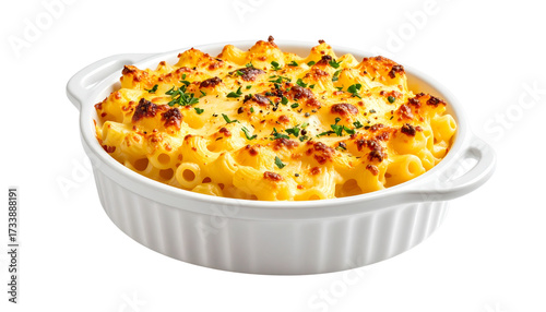 Baked macaroni and cheese in a white dish isolated on solid white background Png format