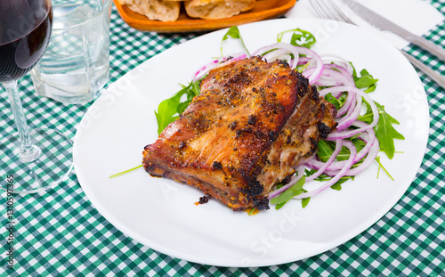 Baked pork ribs baked served at plate with salad from arugula and onion