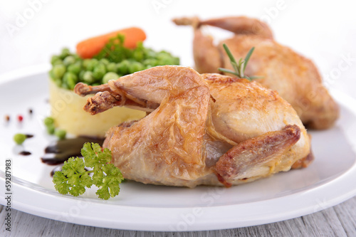 quail, meat, chicken, dinner, grilled, roast, cooked, cookery, culinary, gastronomy, vegetable, eatery, fried, pea, nourishment, food, meal
