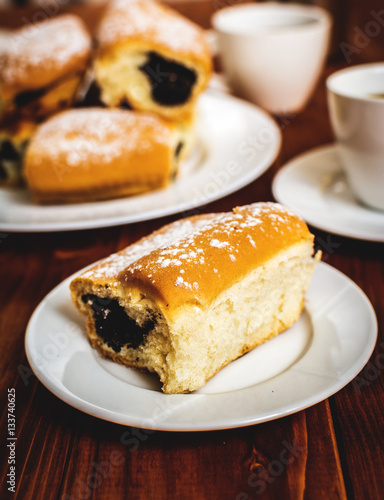 snack, dessert, food, hot drink, fresh, pastry, poppy, bun, sweet, bakery, breakfast, sugar, dough, delicious, traditional, seed, baked, stuffed, cake, homemade, pie, epicure, plate, portion, cookie, morning, wood, cream