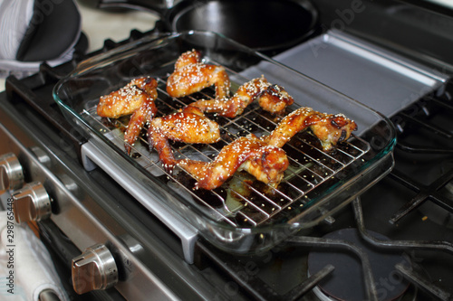 Baked teriayki chicken wings from the oven resting on the stove top in a home kitchen.