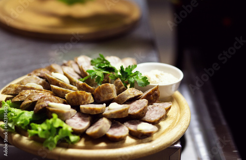 Baked traditional homemade sausage with spices and herbs on the wooden cutting board