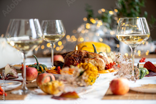 Baked whole chicken or turkey for Christmas. Thanksgiving table with decoration, homemade roasted chicken, wine and salad of fruits, bokeh background