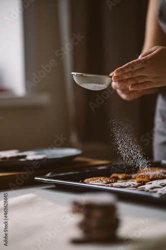 christmas, holiday, gingerbread, tradition, bakery, sugar, sieve, baked, baker, tasty, food, homemade, powdered, strewn, prepare, confectionery, cookie, cooking, kitchen, closeup, one person, hand, female, selective focus, biscuit, cook, festive, preparation, winter, decoration, new year, christmas, traditional, december, various, appetising, topview, copy space, atmospheric