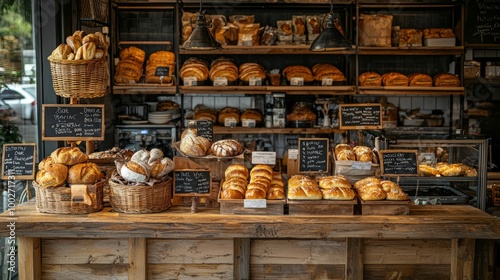 Bakery display with fresh bread and pastries on rustic wooden shelves