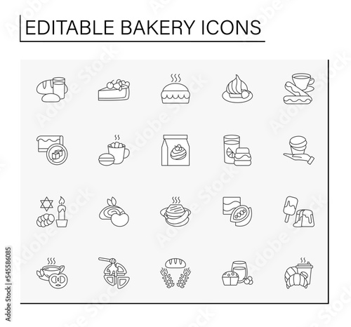 bakery, line, icon, set, sweet, tasty, bread, bun, muffin, pie, cake, cooking, delicious, dessert, traditional, epicure, cookery, bake, baker, menu, dessert, cook, receipe, cake, plate, dinner, food, course, lifestyle, snack, ingredient, dish, linear, vector, illustration, logotype, concept, symbol, web, pictogram, design, isolated, signs, art, editable, graphic, wheat, drink