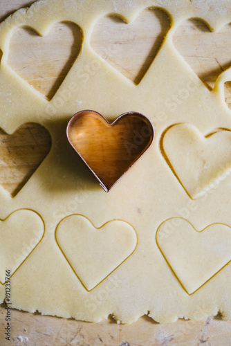 Baking Heart Shaped Cookies for valentine's day, over a wooden background,with cookie cutter with heart shape top view