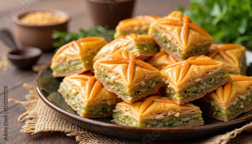baklava, dessert, plate, sweet, pastry, traditional, delicious, layered, nut, honey, arabic, middle eastern, mediterranean, rustic, serving, food, snack, epicure, culinary, cookery, treat, confection, table, gourmet food, sugar, favor, rich, homemade, festive, party, celebration, cultural, sharing, hospitality, eatery, bakery, gold, green, texture, closeup, indulgence, enjoyment, taste, warm, inviting, casual attire, natural, dining