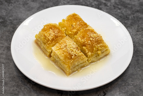 Baklava with milk (sutlu nuriye). Baklava with hazelnut and milk on a dark background.