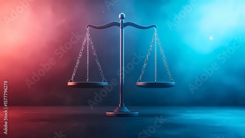 Balanced scales symbolizing justice, set against a gradient background of red and blue hues. It's a striking image capturing the essence of fairness