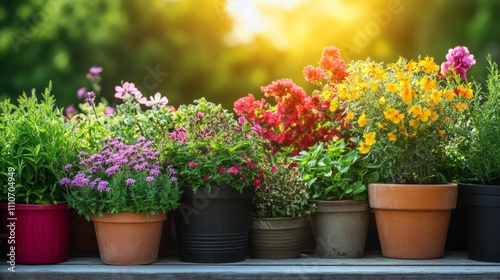 Balcony garden with potted herbs, colorful blooms, decorative pots, natural sunlight, cozy urban setting