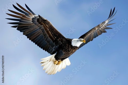 Bald eagle soaring gracefully against a clear blue sky during a sunny afternoon