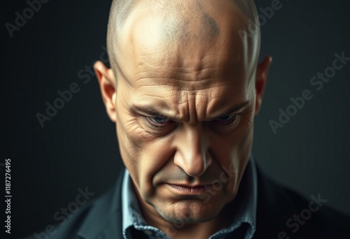 slimmer, space, angle, body, scowling, emotion, portrait, partially, visible, copy, photo, image, sharpened, eye, clear, background, bald, expression, man, blurred, face, people, stern, sharp, negative, human