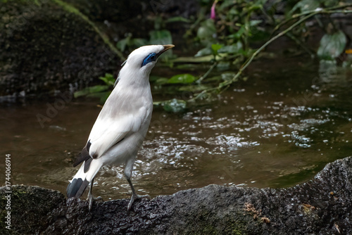 Bali Myna (Leucopsar Rothschildi) perching on a rock, Bali starlings want to bathe in the river, Close up portrait of a Bali myna