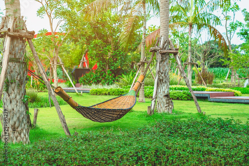 Bamboo wicker hammock hanging on tree for relaxing in the public garden.