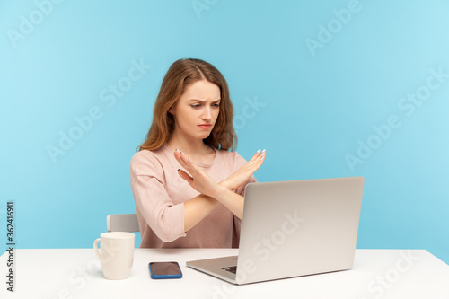 Ban, forbidden service! Angry strict businesswoman crossing arms showing x sign, stop gesture while talking on video call, looking at laptop screen with negative warning expression. indoor studio shot