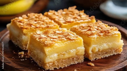dessert, cake, bar, square, banana, cream, custard, topping, snack, treat, sweet, food, baked, receipe, delicious, homemade, easy, tasty, deliciously, pastry, crispy, gold, yellow, food photography, closeup, ingredient, butter, sugar, egg, milk, oven, baking, epicure, simple, comfort, deliciously, carb, energy, epicure